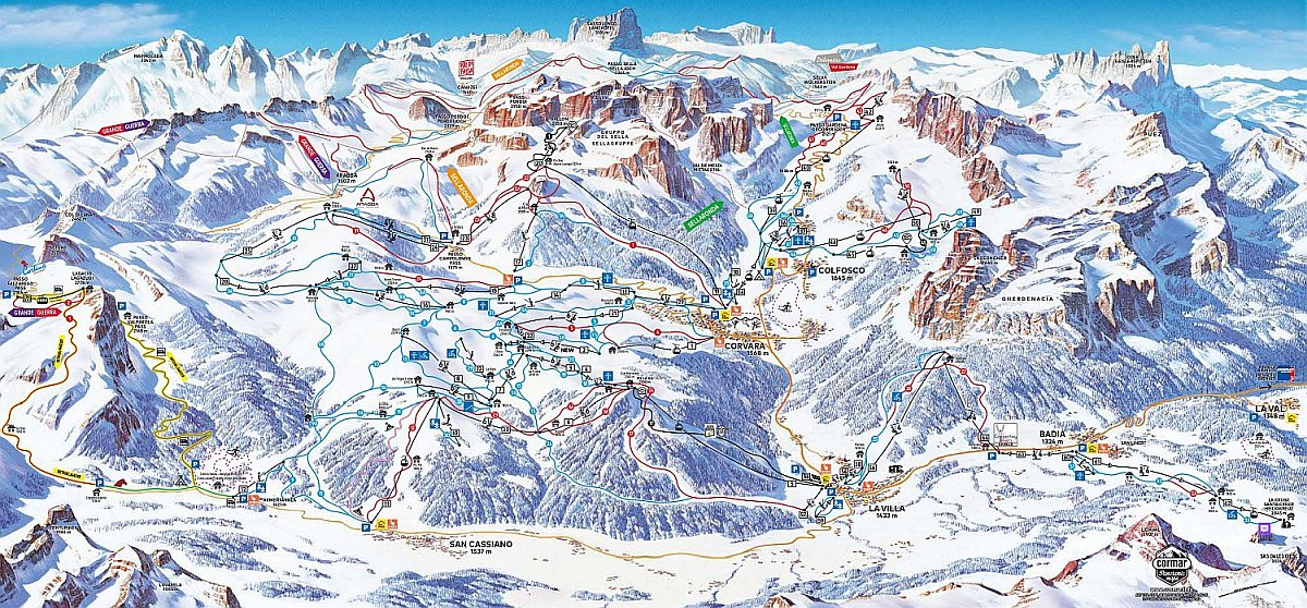 Mapa lyžiarskeho raja v Alta Badii s množstvom zjazdoviek, vlekov a lanoviek (po kliknutí sa zobrazí v novom okne prehliadača vo väčšom rozmere)